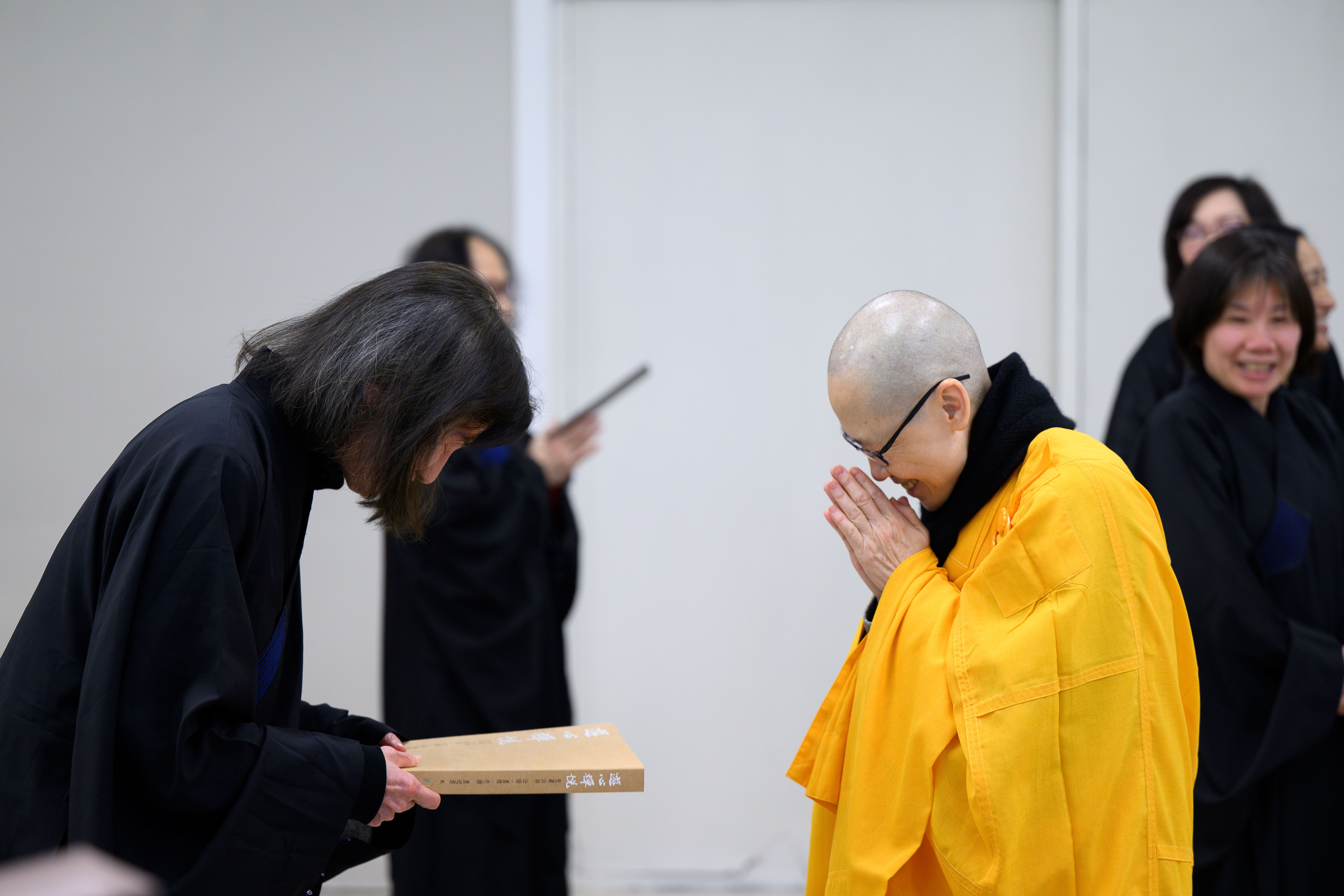 法會結束後,在康吉良菩薩「南無度人師菩薩摩訶薩」的音聲中,大眾出位領取師父墨寶,領受師父的祝福,充滿感恩。常悟法師更特別準備一本《遊心禪悅–法鼓山珍藏聖嚴法師墨跡》,從與會菩薩中抽出一位幸運者結緣,讓活動最後增加溫馨亮點。