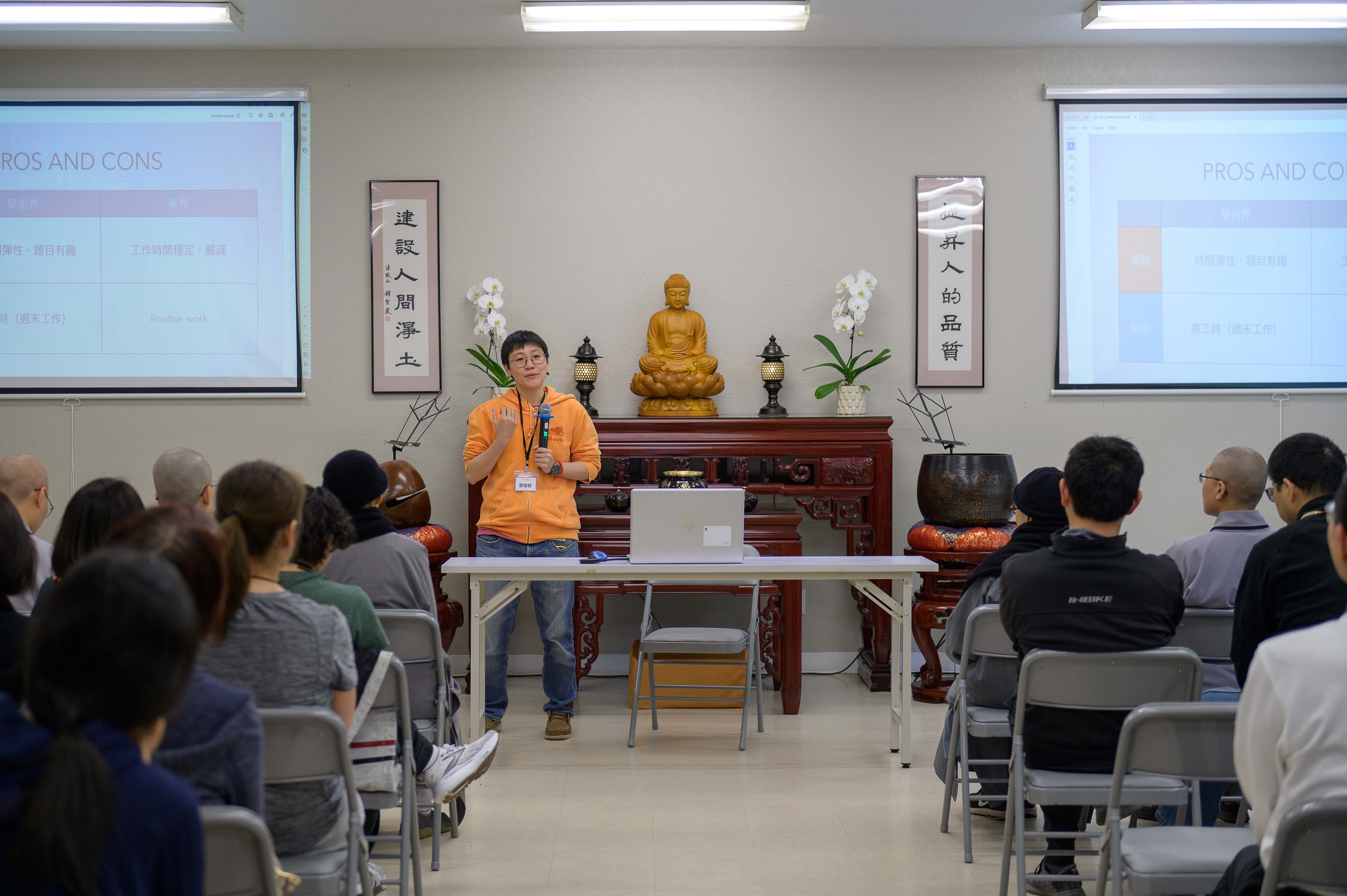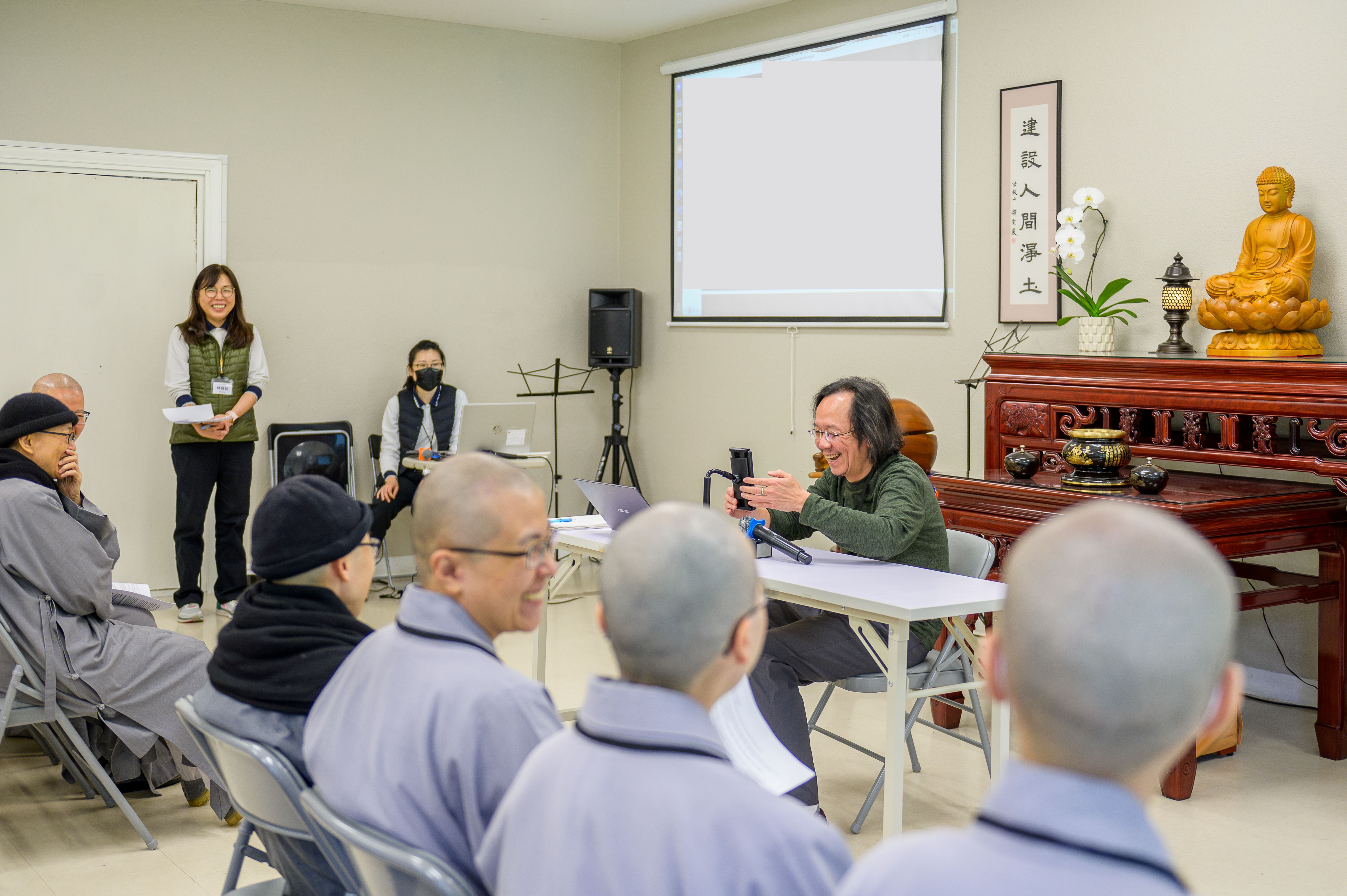 活動上半場由三位信眾主題分享,首先登場的AI科技,由車繼偉菩薩分享。2023年6月退居方丈果東法師關懷西雅圖之行時與他結緣的佛法智能音箱,觸發他在退休之後仍然可以貢獻所學的想法,加上同修學佛的影響,讓他想成就更有價值的人生! 車菩薩正在進行佛法AI專案研究,現場示範與AI機器的對答,得到的回應讓大眾不時發出驚嘆,AI科技帶來的便利與挑戰,已經開始改變我們生活的樣態。