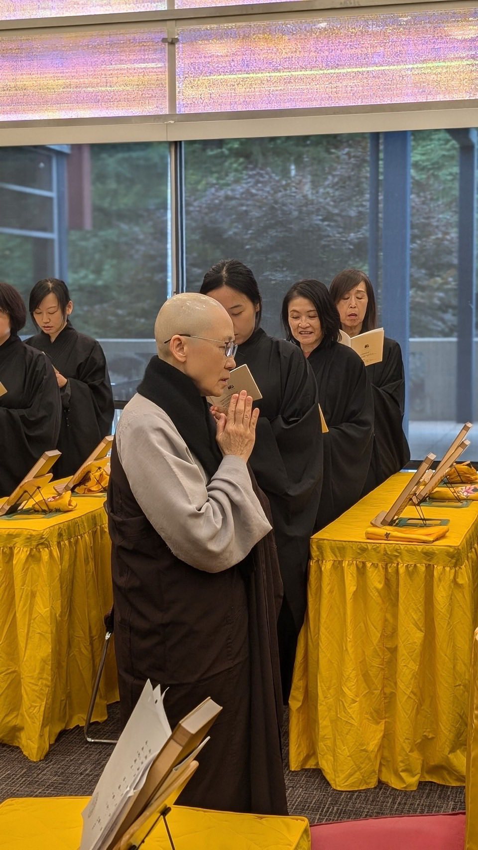 雖然是臨時的場地,大家攝心虔敬的修持地藏法門,法會井然有序的進行,持誦地藏經和聖號、聽聞開示、佛前大供。外護的香積組也貼心準備了可口的午齋、咖啡、水果等。